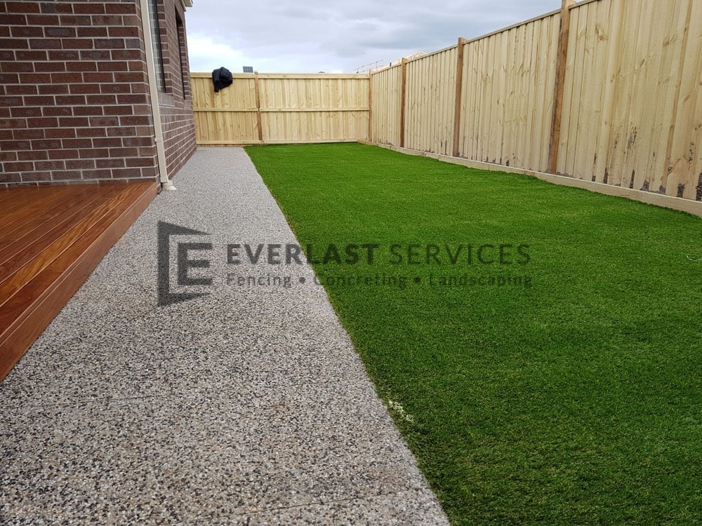 EA61 – Backyard Exposed Aggregate with Synthetic Grass and Decking
